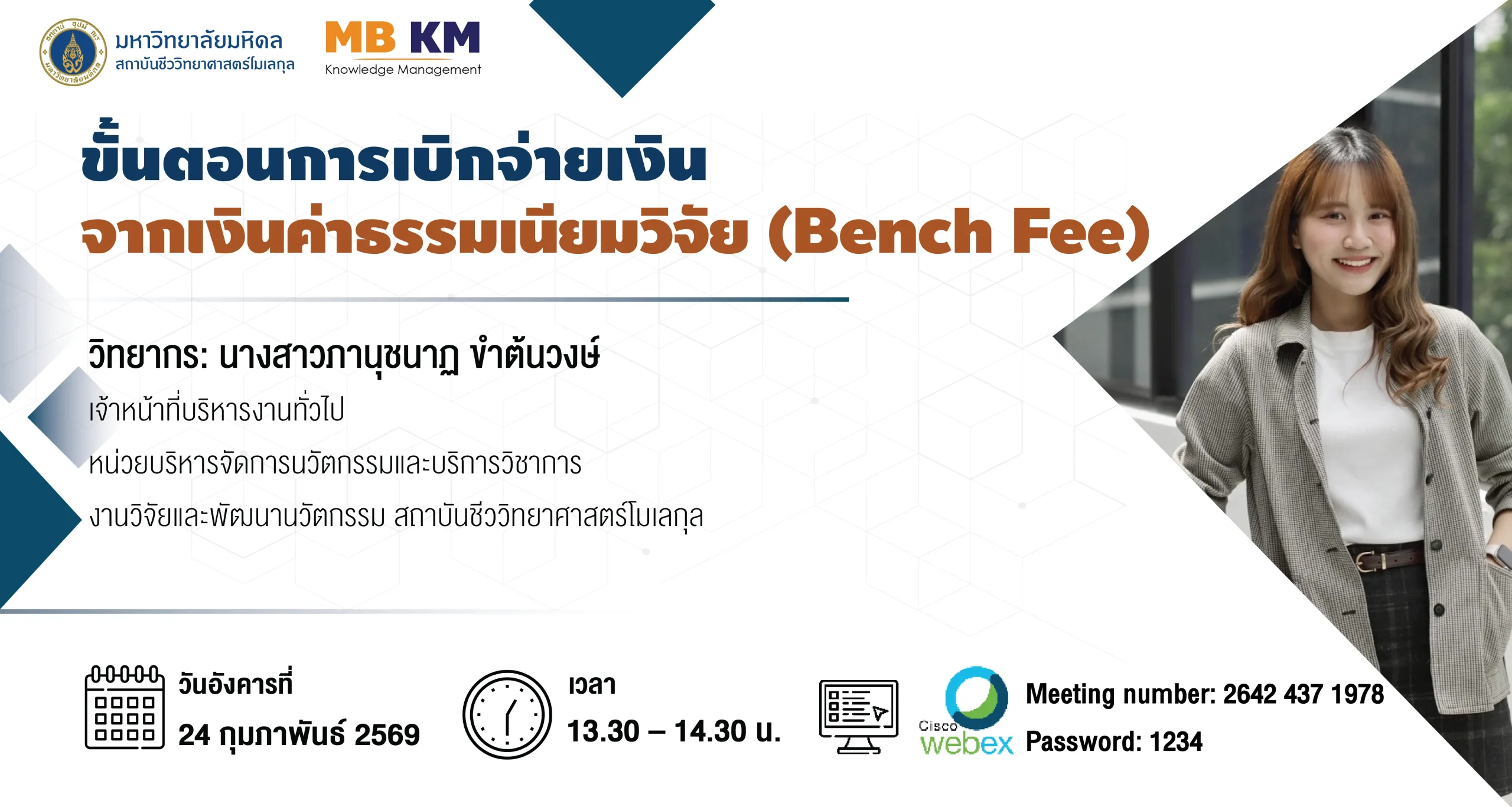 สถาบันชีววิทยาศาสตร์โมเลกุล มหาวิทยาลัยมหิดล ขอเชิญผู้ที่สนใจเข้าร่วมกิจกรรม KM: หัวข้อเรื่อง ขั้นตอนการเบิกจ่ายเงินจากเงินค่าธรรมเนียมวิจัย (Bench Fee)