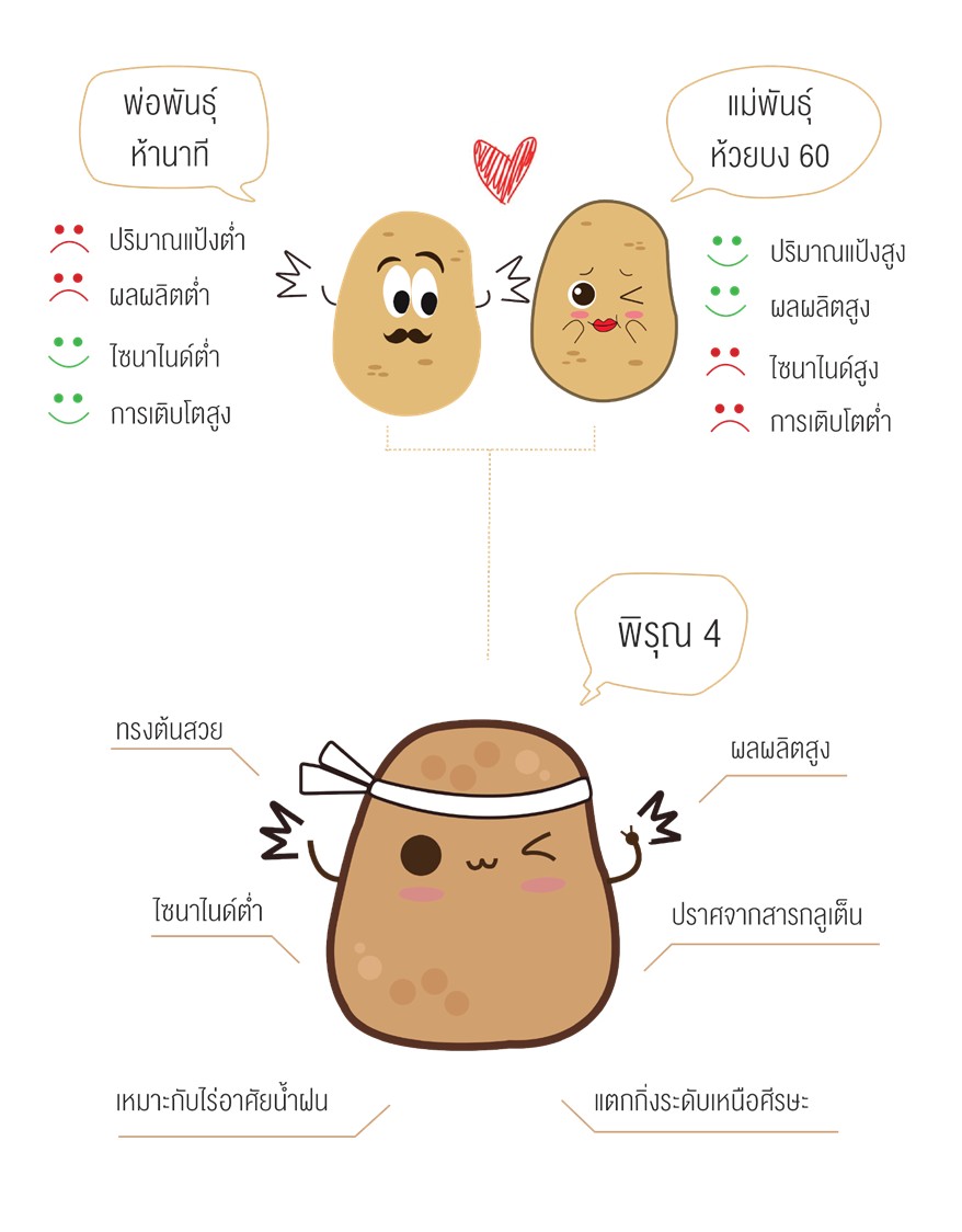 ลูกผสมที่สร้างขึ้น ส่วนหนึ่งนำไปใช้ในการศึกษาเครื่องหมายโมเลกุล (DNA-marker) ซึ่งจะใช้เป็นเครื่องมือในการคัดเลือกพันธุ์มันสำปะหลัง (Marker assisted selection; MAS) ในอนาคต อีกส่วนหนึ่งนำไปคัดเลือกและประเมินพันธุ์ตามแบบวิธีมาตรฐาน (conventional breeding) และได้ประยุกต์ใช้เพื่อพัฒนามันสำปะหลังทั้งในสายพันธุ์ที่ปลูกเพื่อป้อนโรงงานอุตสาหกรรม (พิรุณ 1) ที่ให้ผลผลิตสูง แป้งสูง และทนต่อโรคพืช และสายพันธุ์ที่ปลูกเพื่อการบริโภค (พิรุณ 2 และพิรุณ 4) ซึ่งมีจุดเด่นอีกอย่างหนึ่ง คือ ปราศจากสารกลูเต็น (gluten) สามารถนำไปพัฒนาเป็นแป้งฟลาวที่ใช้ทดแทนแป้งสาลีในการทำผลิตภัณฑ์เบเกอรี ต่อยอดไปสู่ผลิตภัณฑ์เพื่อสุขภาพได้อีกด้วย