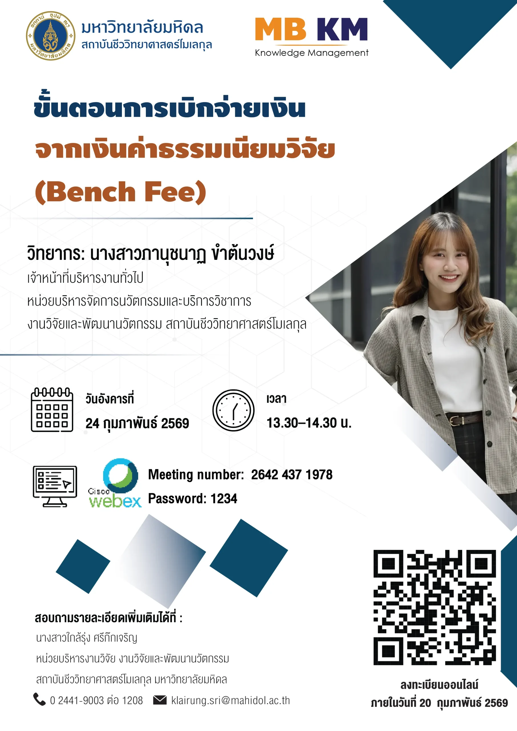 สถาบันชีววิทยาศาสตร์โมเลกุล มหาวิทยาลัยมหิดล ขอเชิญผู้ที่สนใจเข้าร่วมกิจกรรม KM: หัวข้อเรื่อง ขั้นตอนการเบิกจ่ายเงินจากเงินค่าธรรมเนียมวิจัย (Bench Fee)