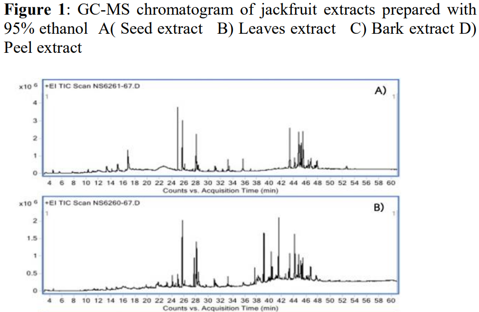 Jackfruit (Artocarpus heterophyllus Lam.), a tropical plant widely cultivated for its edible fruit, has been traditionally used in folk medicine for its potential therapeutic properties. Despite its extensive use, limited studies have comprehensively evaluated the antimicrobial efficacy and chemical composition of its various plant parts. This study investigates the antimicrobial properties and chemical composition of 95% ethanol extracts from the bark, leaves, peel, and seeds of jackfruit, aiming to explore their potential as natural antimicrobial agents.